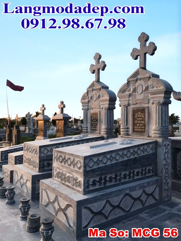 Mẫu mộ đá Công giáo MCG 56 có thiết kế trang nghiêm với cấu trúc hình chữ nhật truyền thống. Bề mặt mộ được chia thành các tầng với các chi tiết hoa văn nổi bật, chủ yếu là hoa văn Tứ quý mang ý nghĩa phong thủy sâu sắc. Phần bia mộ cao với mái vòm cong mềm mại, phía trên đặt thánh giá lớn, thể hiện đặc trưng của đạo Công giáo.