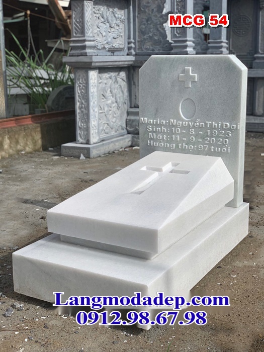 Mẫu mộ Công Giáo được thiết kế đơn giản nhưng đầy trang nghiêm, phù hợp với tín ngưỡng Công Giáo. Mộ có dáng chữ nhật gọn gàng, bao gồm ba phần chính: đế, thân mộ và bia mộ. Đế mộ là khối đá chắc chắn, nâng đỡ phần thân. Thân mộ được chế tác tinh xảo với bề mặt hơi nghiêng, nổi bật biểu tượng cây thánh giá được khắc chìm. Bia mộ hình chữ nhật đứng thẳng, khắc rõ tên thánh, thông tin người mất, cùng biểu tượng chữ thập trang nghiêm, biểu thị niềm tin vào Chúa.