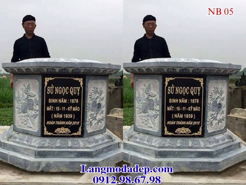Mộ đá bát giác NB 05 là mẫu mộ cao cấp với thiết kế độc đáo gồm 8 mặt đều nhau, tạo nên vẻ đẹp hài hòa và trang nghiêm. Phần mái được chạm khắc tinh xảo theo hình dáng bát giác, có đường diềm uốn lượn mềm mại.