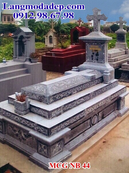 Mẫu mộ MCG 44 có thiết kế dạng chữ nhật nằm ngang với cấu trúc tam cấp, tạo nên sự vững chãi và trang trọng. Bề mặt mộ được chạm khắc tinh xảo với các họa tiết hoa văn tứ quý – tượng trưng cho bốn mùa trong năm, mang ý nghĩa trọn vẹn và hài hòa. Phần bia mộ được thiết kế đơn giản nhưng trang nghiêm, phía trên là một thánh giá lớn biểu tượng cho tín ngưỡng Công giáo.