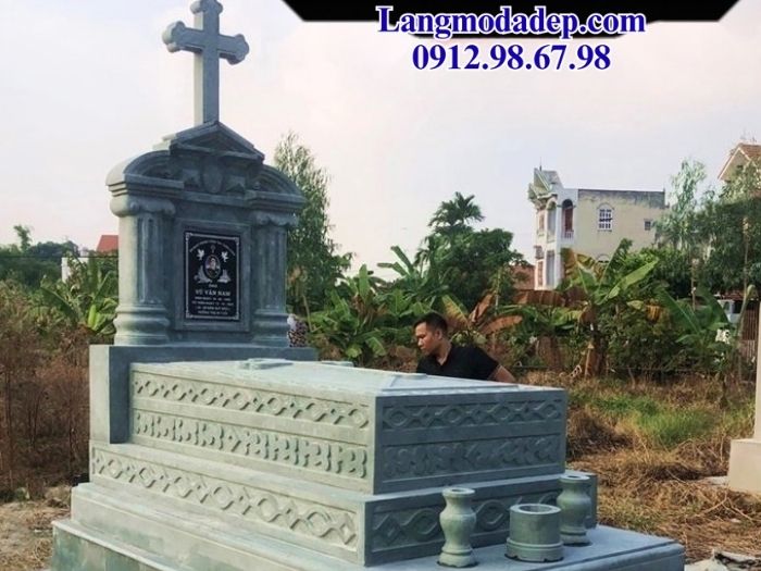 Mẫu mộ Công Giáo đá xanh rêu MCG 65 mang vẻ đẹp truyền thống, thể hiện sự trang nghiêm và tín ngưỡng của đạo Công Giáo. Mộ có hình dáng chữ nhật với các tầng đế được chạm khắc tinh xảo. Phần bia mộ được thiết kế cao vững chắc, phía trên cùng có cây thánh giá nổi bật – biểu tượng đặc trưng của Công Giáo. Các hoa văn trên mộ được chạm khắc tỉ mỉ, nhẹ nhàng, tạo nên vẻ đẹp hài hòa và trang trọng.