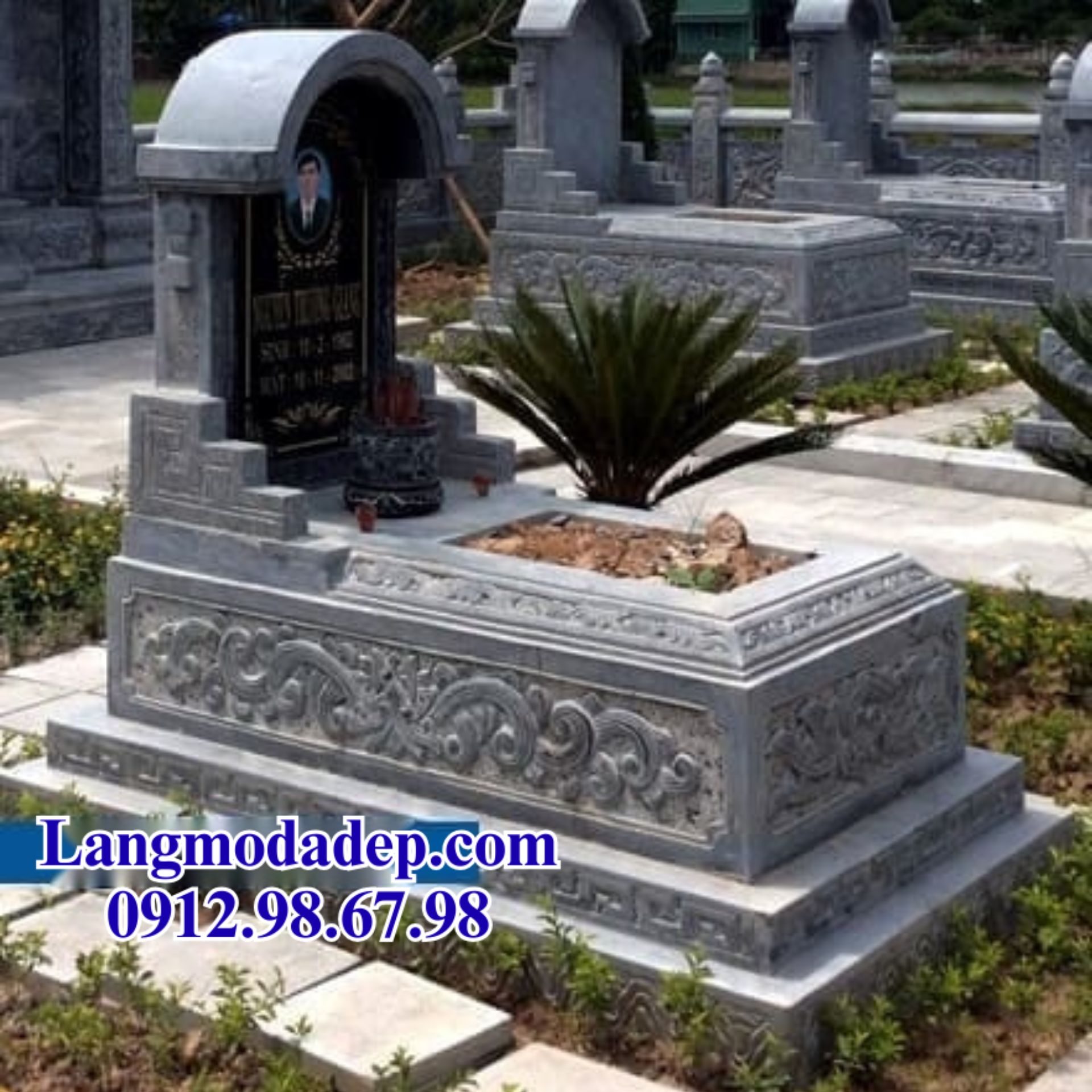 Mẫu mộ đá này toát lên vẻ đẹp trang nghiêm và cổ kính với thiết kế tinh xảo. Mộ có phần mái vòm uy nghi, tạo điểm nhấn ấn tượng. Phần đế mộ được xây thành các bậc vững chắc, chạm khắc hoa văn hoa lá, đám mây uốn lượn tinh xảo, mang đến cảm giác quyền quý và sang trọng.