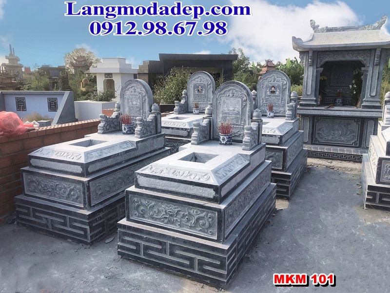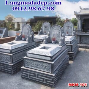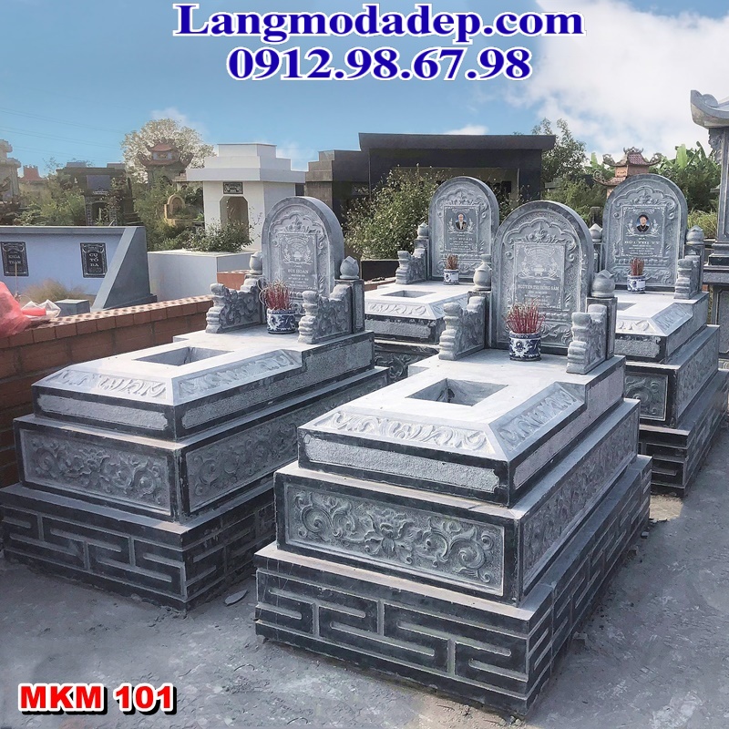 Mẫu mộ đơn MKM 101 được chế tác từ khối đá xanh rêu nguyên khối, mang đến vẻ đẹp trầm mặc, cổ kính và sang trọng. Thiết kế mộ có hình chữ nhật truyền thống, phần đế được phân thành 3 bậc vững chắc. Phần thân mộ được trang trí bởi những đường nét hoa văn tinh xảo, nổi bật với hình ảnh hoa sen, xen kẽ với các chi tiết hoa lá khác.