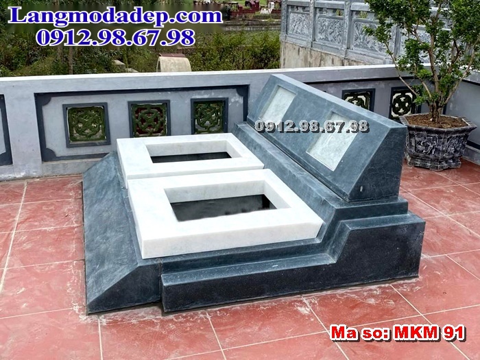 Mộ đá không mái MKM 91 có thiết kế đơn giản, hiện đại với các đường nét vuông vắn, khỏe khoắn. Mộ được chia thành hai phần chính: phần đế và phần thân. Phần đế có kích thước lớn hơn, được làm từ đá xanh đen, tạo cảm giác vững chắc. Phần thân là khối hình vuông màu trắng, tạo điểm nhấn và sự cân đối cho tổng thể.