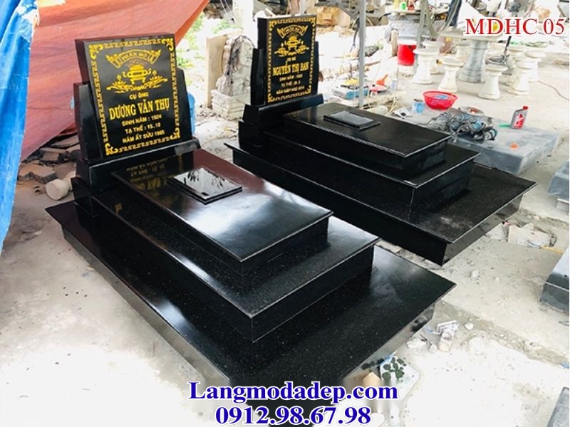 Mộ đá hoa cương đẹp – MDHC 05 được chế tác từ đá hoa cương nguyên khối với màu đen bóng sang trọng, bề mặt nhẵn mịn và liền mạch, tạo cảm giác chắc chắn và trang nghiêm. Phần nền mộ được thiết kế rộng rãi, chia thành hai khu vực rõ ràng, phù hợp để xây dựng mộ đôi hoặc mộ gia đình.