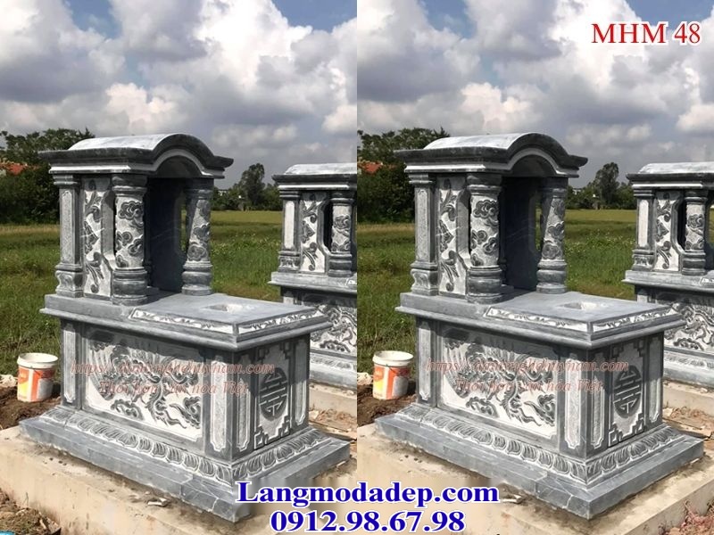 Mộ đá hai mái xanh đen rồng phượng MHM 48 được chế tác từ đá xanh đen nguyên khối, mang vẻ đẹp trang nghiêm, tinh tế và bền vững theo thời gian. Thiết kế hai mái cong nhẹ, nâng đỡ bởi các cột đá chạm khắc tinh xảo, tạo nên sự hài hòa giữa nét thanh thoát và uy nghiêm, phù hợp với không gian thờ tự linh thiêng.