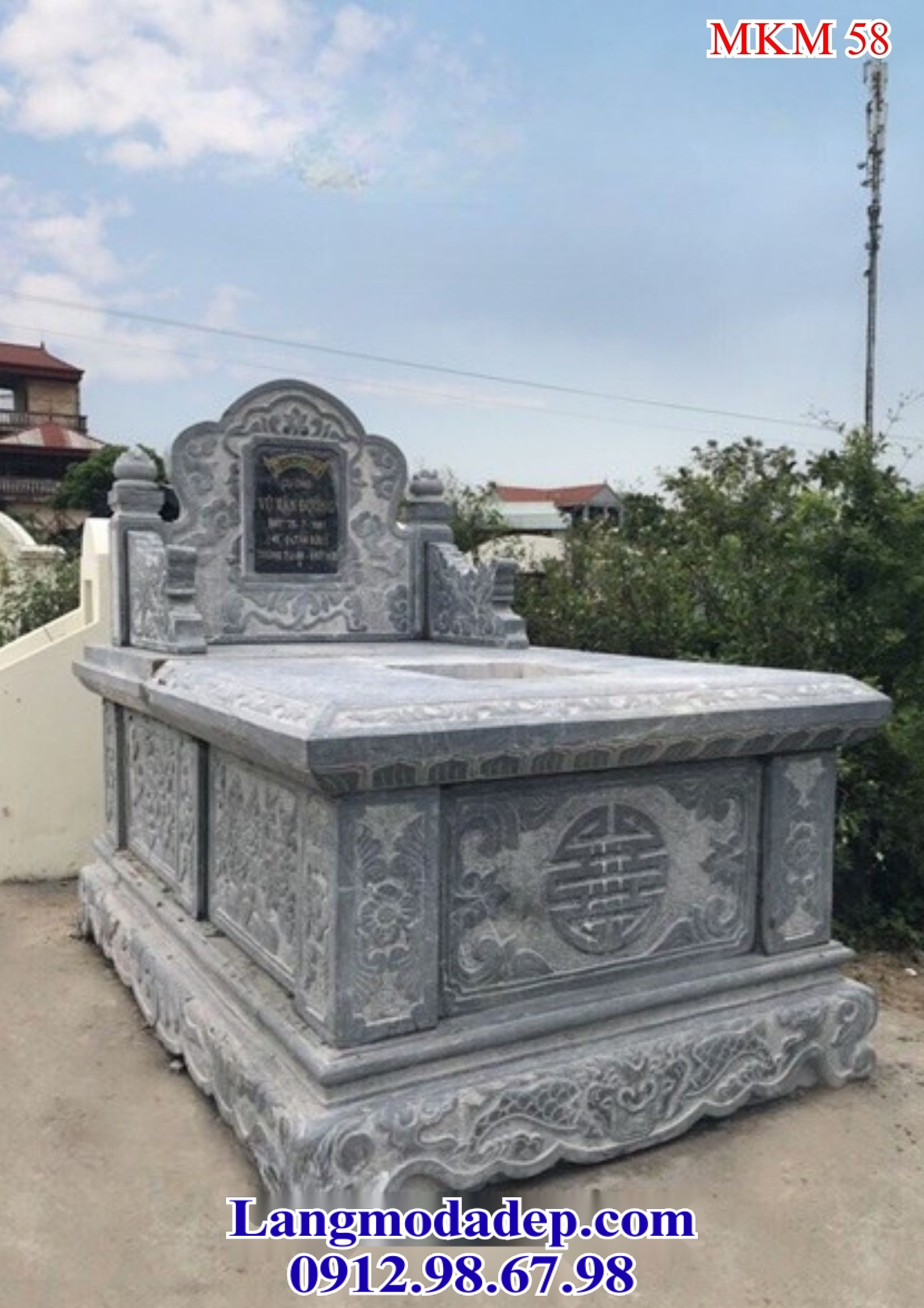 Mộ đá tam sơn hậu bành không mái – MKM 58 là mẫu mộ được thiết kế cầu kỳ và tinh xảo, mang phong cách truyền thống với vẻ đẹp trang nghiêm và bề thế. Mộ có kích thước lớn, phần thân hình chữ nhật được gia công kỹ lưỡng với các mặt bên chạm khắc họa tiết kỷ hà, hoa lá và chữ Thọ nổi bật, biểu trưng cho sự trường thọ và an lành. Điểm nhấn của mẫu mộ này là phần hậu bành cao, có hình vòm uốn cong nhẹ ở trên, được chạm khắc hoa văn mềm mại, tạo cảm giác thanh thoát nhưng vẫn rất vững chắc.