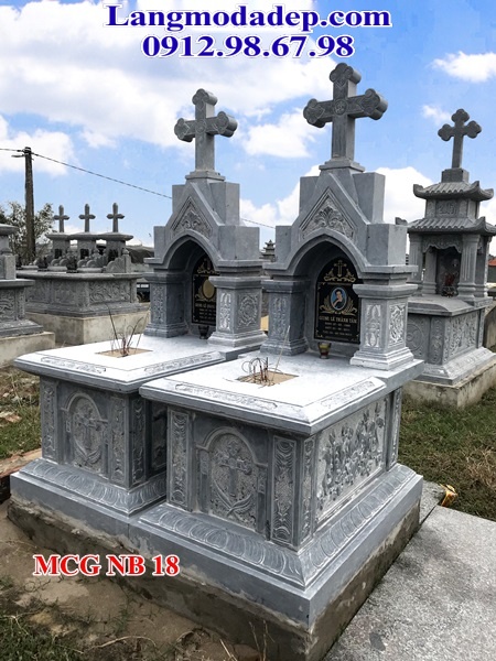 Mẫu mộ Công Giáo đá NB 18 có phần đế mộ được làm vuông vức, tạo cảm giác bền vững và chắc chắn. Phần thân mộ được chạm khắc hoa văn tinh xảo, nổi bật là các họa tiết Công Giáo như cây thánh giá, hình ảnh Thiên Chúa, và các hoa văn biểu tượng tâm linh khác. Phần bia mộ được thiết kế kiểu dáng vòm nhọn, phía trên đặt một cây thánh giá lớn tượng trưng cho niềm tin và sự che chở của Chúa. Xung quanh mộ là những chi tiết hoa văn nổi khắc thủ công, thể hiện sự trang trọng, tôn kính đối với người đã khuất.
