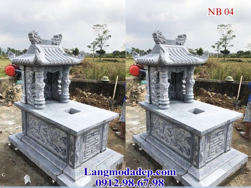 Mộ một mái đá NB 04 được chế tác từ đá xanh đen nguyên khối, toát lên vẻ đẹp trầm mặc và tinh tế, phù hợp với không gian linh thiêng. Thiết kế ba tầng mái cong mềm mại, kết hợp cùng các cột đá tròn vững chãi, tạo nên sự hài hòa giữa nét thanh thoát và sự bề thế, làm nổi bật giá trị văn hóa truyền thống.