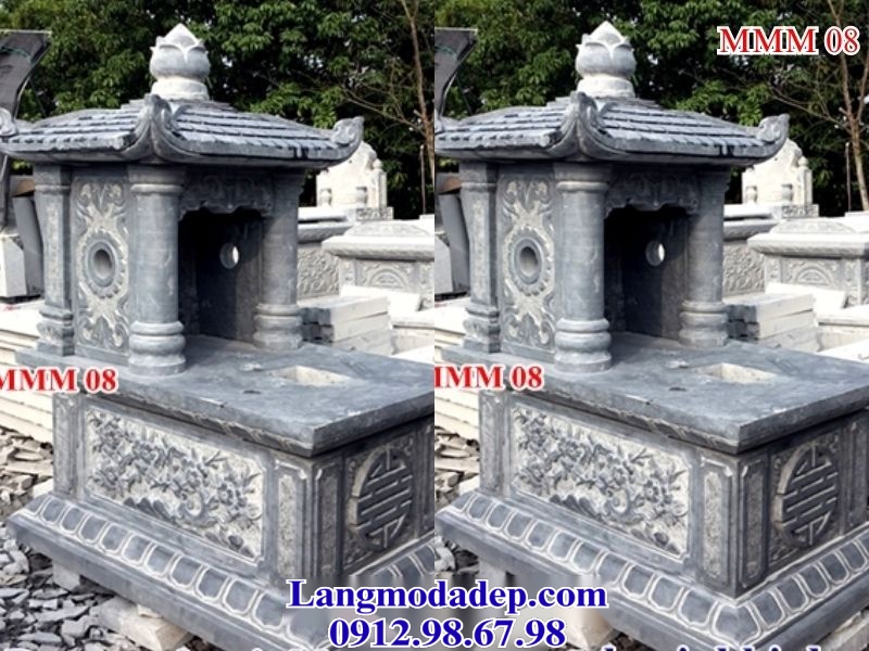 Mộ một mái đá – MMM 08 được chế tác từ đá xanh đen nguyên khối với thiết kế tinh tế, mang đậm phong cách truyền thống nhưng vẫn toát lên vẻ trang nghiêm, thanh thoát. Điểm nổi bật của mẫu mộ này nằm ở phần mái được tạo hình uốn cong mềm mại, chạm khắc tinh xảo những họa tiết rồng, hoa sen và chữ Hán. Từng chi tiết đều được thực hiện tỉ mỉ, giúp công trình không chỉ bền đẹp mà còn mang ý nghĩa phong thủy sâu sắc, tượng trưng cho sự tôn kính và lòng biết ơn với người đã khuất.