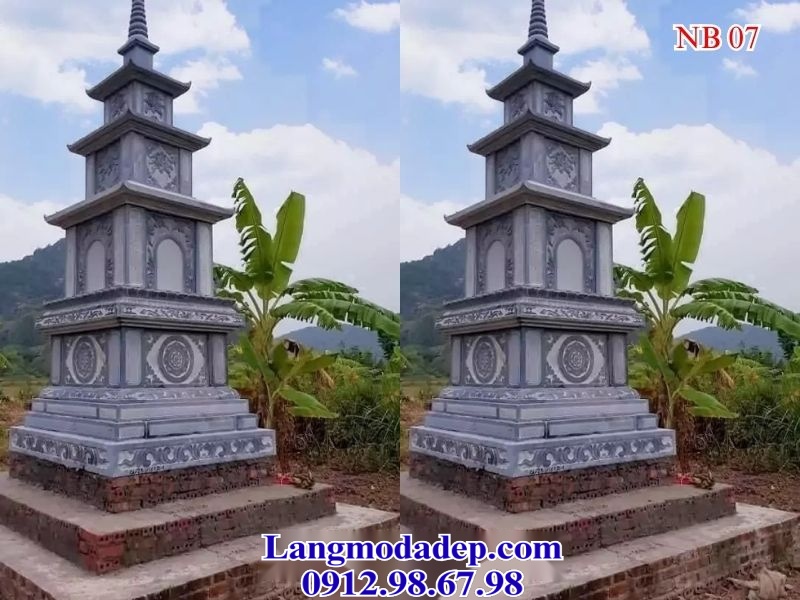 Mộ tháp đá NB 07 là một công trình nghệ thuật được chế tác hoàn toàn từ đá xanh rêu nguyên khối – loại đá tự nhiên nổi tiếng với độ bền cao, khả năng chống chịu tốt trước mọi điều kiện thời tiết khắc nghiệt. Thiết kế 7 tầng mái theo kiểu dáng truyền thống tạo sự cân đối, tượng trưng cho sự thăng tiến trong tinh thần và sự thanh tịnh của cõi Phật.