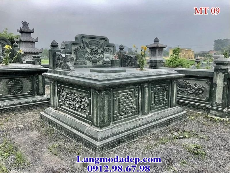 Đá xanh được khai thác từ các mỏ đá tự nhiên tại Ninh Bình, nổi tiếng với độ cứng cao, khả năng chống chịu thời tiết tuyệt vời và màu sắc đẹp bền theo thời gian. Về mặt phong thủy, mẫu mộ này được thiết kế để tăng cường phúc khí cho con cháu, đồng thời tạo nơi an nghỉ trang nghiêm cho người đã khuất, góp phần bảo vệ âm đức và phát triển vượng khí cho dòng họ.